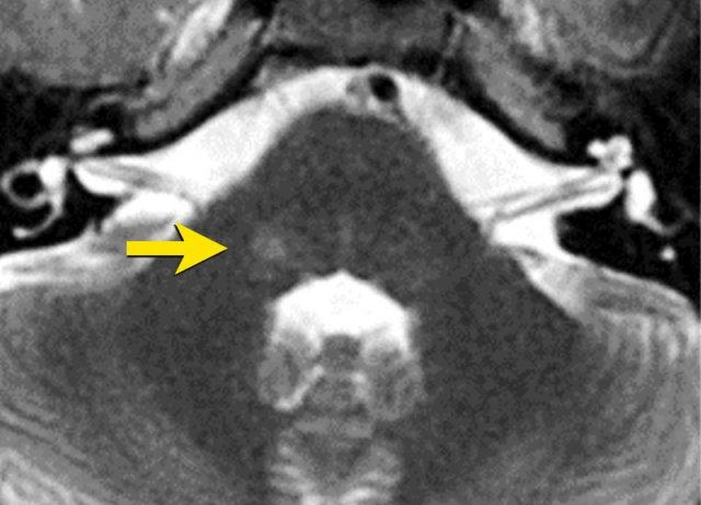 Hình ảnh chuỗi xung T2W theo mặt phẳng axial cho thấy một tổn thương tăng tín hiệu tại nhân dây thần kinh sinh ba (mũi tên).