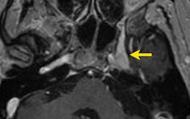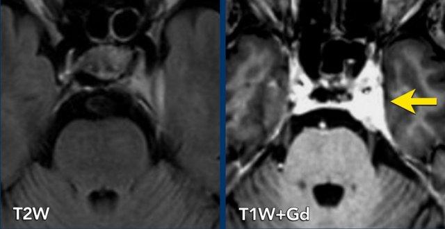 Hình ảnh sau tiêm thuốc tương phản từ cho thấy tăng ngấm thuốc ở xoang hang bên trái, lan rộng vào hang Meckel.