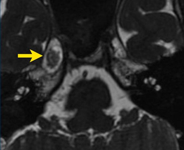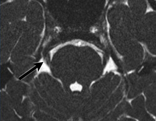 Chuỗi xung T2W cắt ngang cho thấy một tổn thương tại hang Meckel và đoạn bể dịch não tủy của dây thần kinh sinh ba. Thành phần trong hang Meckel có cấu trúc đặc và ngấm thuốc tương phản từ đồng nhất trên ảnh T1W sau tiêm (mũi tên).