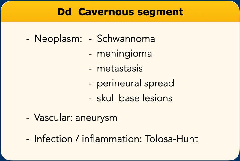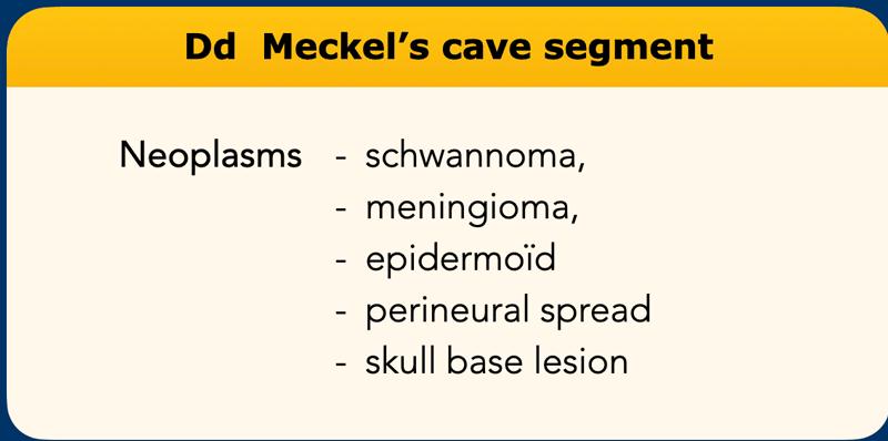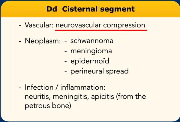 - Tân sinh: u bao thần kinh (schwannoma), u màng não (meningioma), u bì dạng thượng bì (epidermoïd), lan theo bao thần kinh (perineural spread)