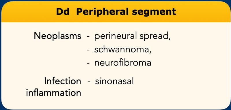 Hơn nữa, các nhánh ngoại vi có thể bị ảnh hưởng bởi các quá trình nhiễm trùng hoặc viêm, chủ yếu là viêm thần kinh có nguồn gốc từ các xoang cạnh mũi.