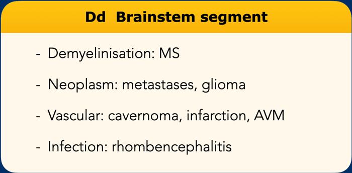 Các loại bệnh lý khác tại đoạn thân não bao gồm u tân sinh (chủ yếu là u thần kinh đệm và di căn), tổn thương mạch máu (nhồi máu, u hang) và nhiễm trùng (viêm não sau).