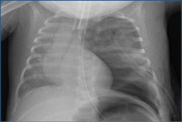 - Trung thất lệch sang phải. Tuy nhiên không có tràn khí màng phổi áp lực, vì cơ hoành vẫn có bờ trên lồi bình thường.