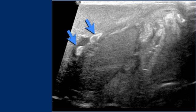 Ở bệnh nhân này, siêu âm phát hiện huyết khối trong tĩnh mạch cửa trái sau khi đặt đường truyền tĩnh mạch rốn (các mũi tên).