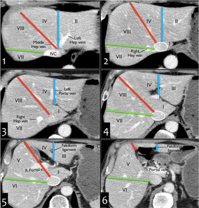 Hình này là mặt cắt ngang qua các phân thùy gan trên, được phân chia bởi tĩnh mạch gan phải, tĩnh mạch gan giữa và dây chằng liềm.