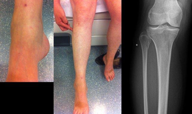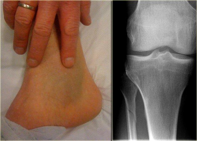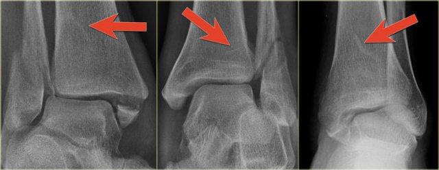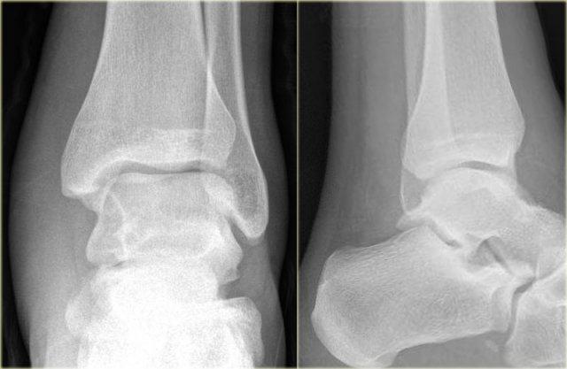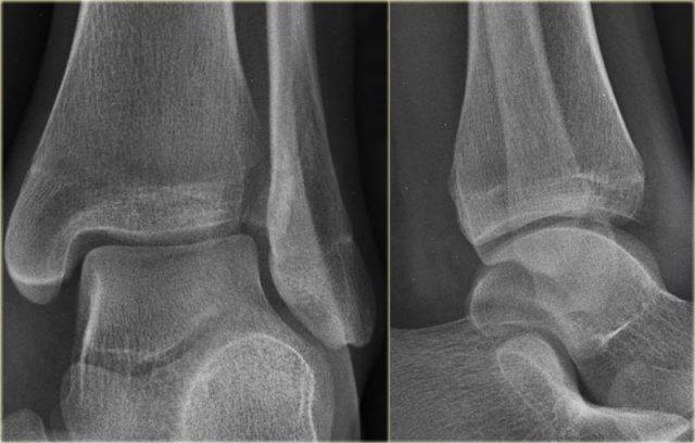 Trong trường hợp này không thấy gãy xương, mà chỉ có sưng nề phần mềm ở phía trong cổ chân.