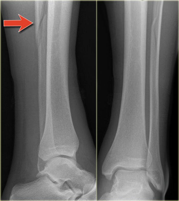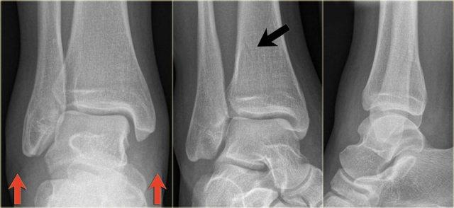 Thoạt nhìn, hình ảnh này có vẻ giống gãy xương Weber B với đường gãy chéo ở xương mác quan sát thấy trên tư thế chụp nghiêng (mũi tên đen).