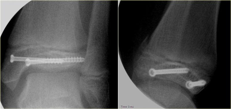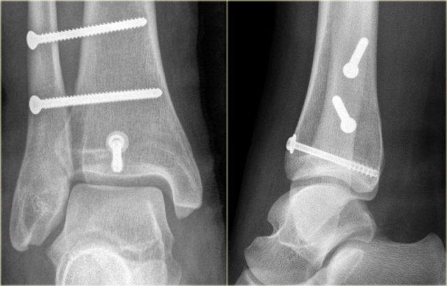 Trong phẫu thuật, cổ chân được xác định là không vững và vít cố định khớp chày mác đã được đặt vào.