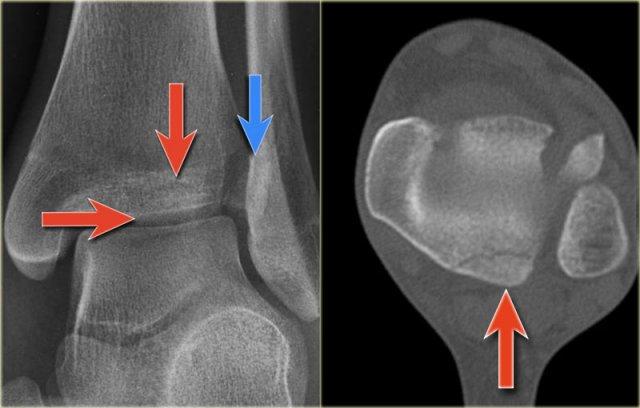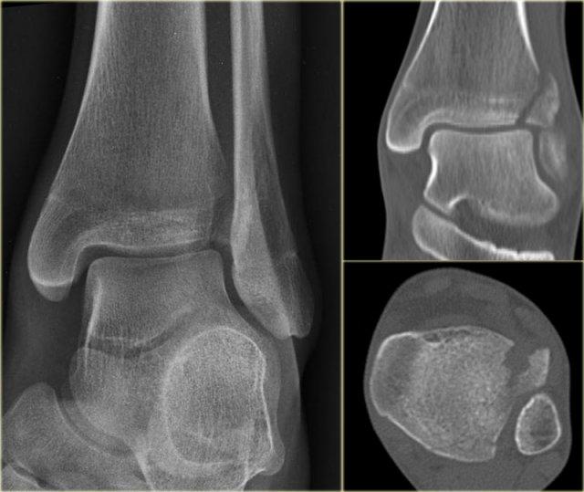 Hình X-quang cho thấy một gãy xương Tillaux kín đáo, được thể hiện rõ hơn trên các hình ảnh CT.