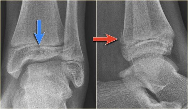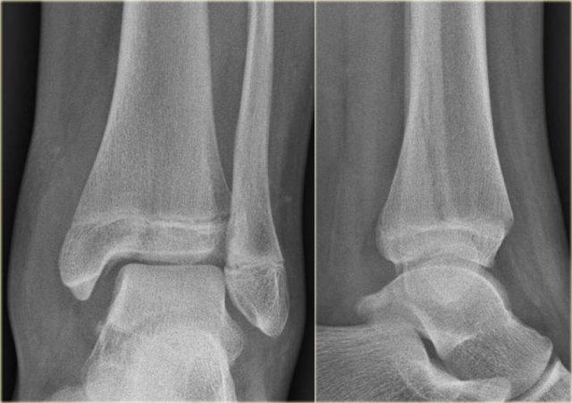 Lưu ý rằng đồng thời có gãy xương Tillaux.
