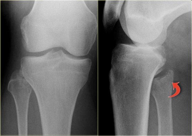 Mảnh gãy hành xương rất nhỏ, đây thường là trường hợp hay gặp (mũi tên đỏ).