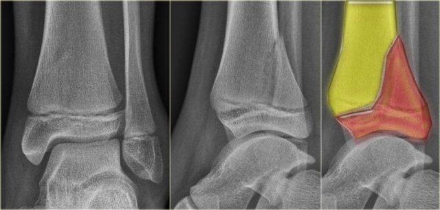 Ở độ tuổi này, đây là đường gãy đi qua sụn tiếp hợp và được gọi là gãy xương Tillaux thiếu niên (juvenile Tillaux).