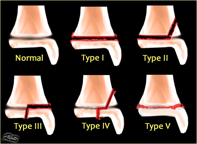 - Type IV – gãy xương qua cả ba thành phần của xương: tấm sụn tiếp hợp, hành xương và đầu xương