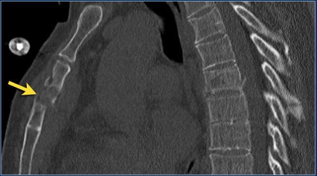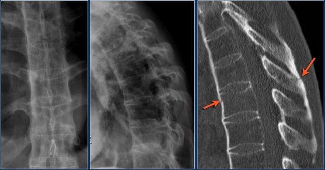 Tuy nhiên, CT cho thấy một đường gãy mảnh qua mặt trước thân đốt sống và cả qua mỏm gai.