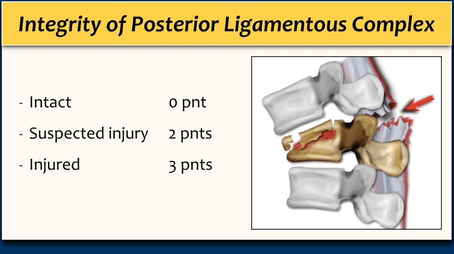 Tính toàn vẹn của phức hợp dây chằng sau đóng vai trò quan trọng trong TLICS. Đôi khi có thể xác định tổn thương PLC trên CT, nhưng đôi khi cần thiết phải chụp MRI.