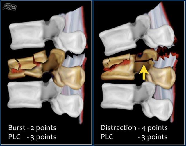 Gãy xương dạng nén được tính 1 điểm. Khi có thêm thành phần vỡ vụn (burst), sẽ được cộng thêm 1 điểm, tổng cộng là 2 điểm.