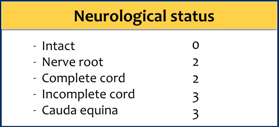 Một trong những điểm mấu chốt ở đây là tổn thương tủy không hoàn toàn có khả năng được hưởng lợi nhiều hơn từ phẫu thuật so với tổn thương hoàn toàn; do đó tổn thương tủy hoàn toàn chỉ được tính 2 điểm, trong khi tổn thương tủy không hoàn toàn được tính 3 điểm.