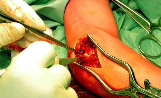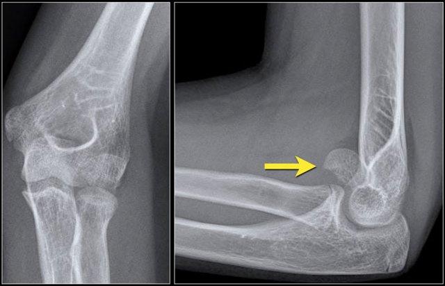 mảnh xương có thể bị kẹt vào giữa bề mặt khớp của xương cánh tay và mỏm khuỷu (hình).