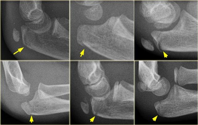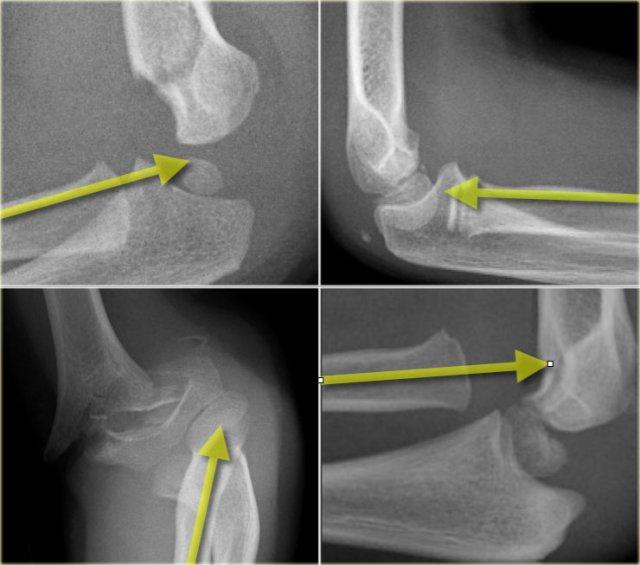 Bên trái là một số ví dụ về gãy mỏm khuỷu.