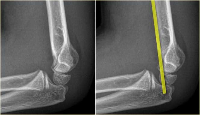 Một đường kẻ qua trung tâm cổ xương quay phải đi qua trung tâm của chỏm con, bất kể tư thế của bệnh nhân như thế nào, vì xương quay khớp với chỏm con (hình minh họa).