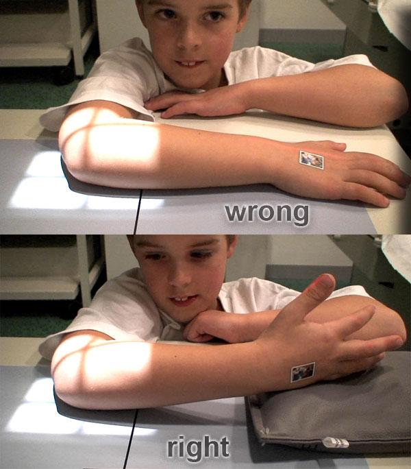 Giải pháp là nâng bàn khám lên để nâng khuỷu tay lên hoặc hạ thấp vai bằng cách đặt bệnh nhân ngồi trên ghế thấp hơn.