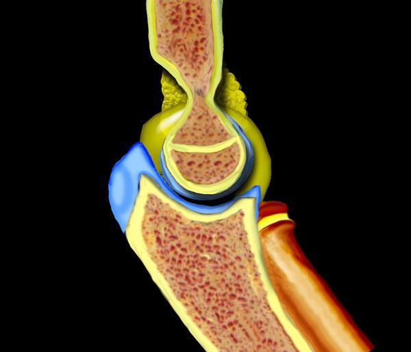 - Lưu ý rằng chỉ có tràn dịch khớp mức độ nhẹ (dấu hoa thị). Mỏm trên lồi cầu trong là cấu trúc ngoài khớp và sự bong gân sẽ không gây ra tràn dịch khớp. Lượng nhỏ tràn dịch khớp có thể là kết quả của tình trạng trật khớp trước đó.
