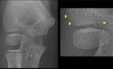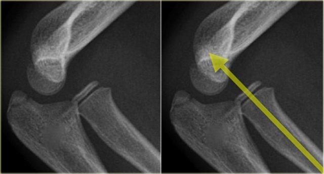 Khi đầu xương quay còn rất nhỏ, trượt đầu xương quay có thể bị bỏ sót (hình).