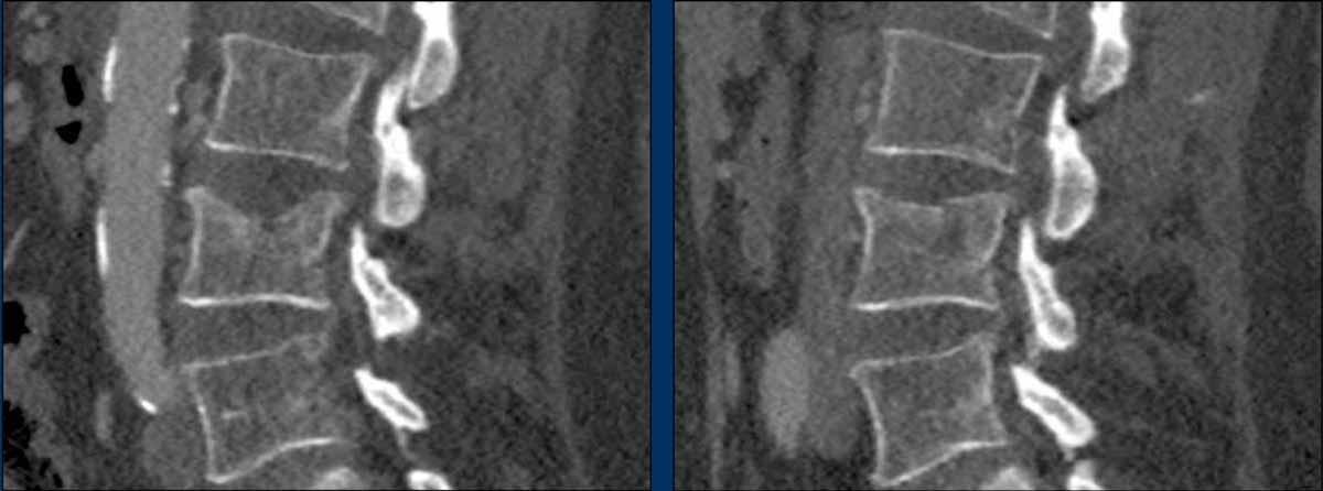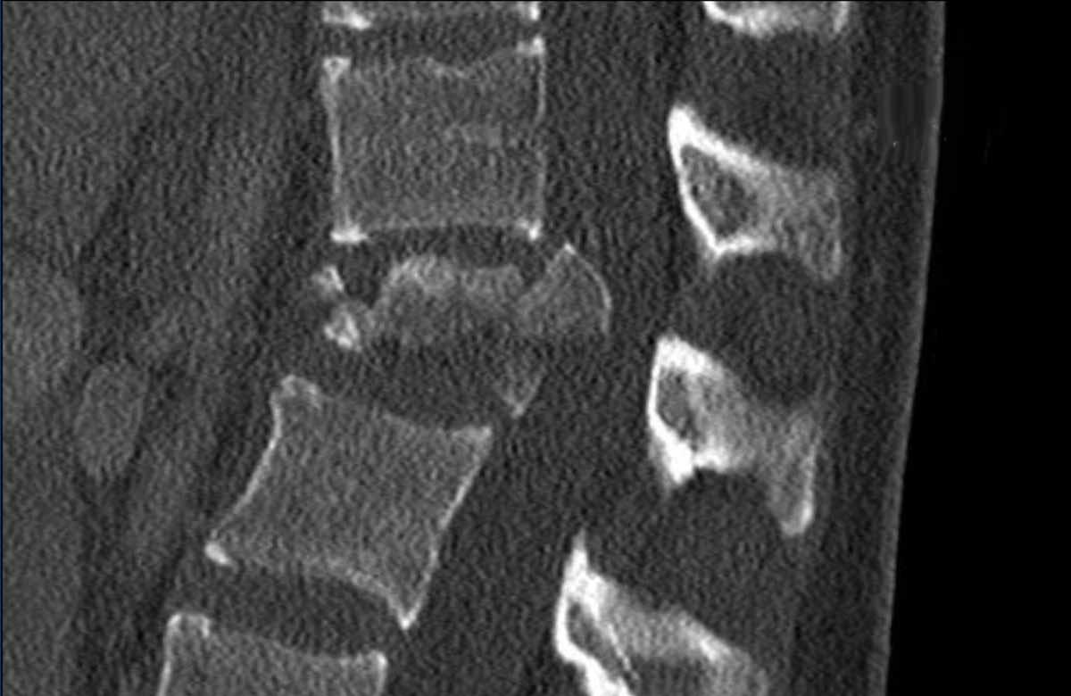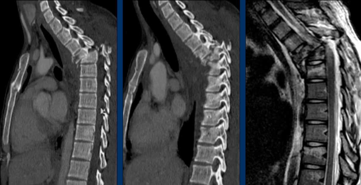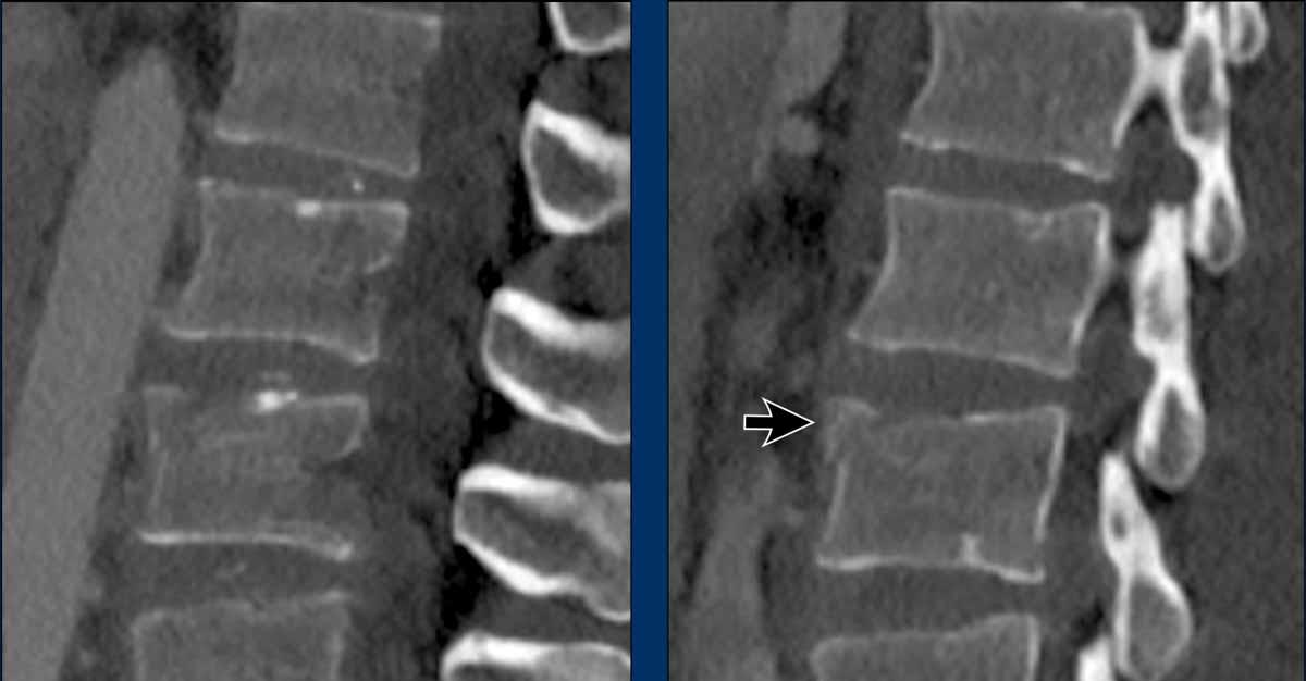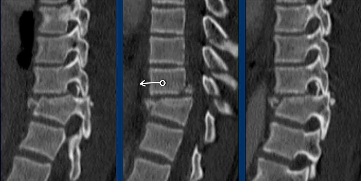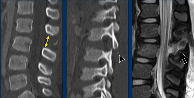 Yes, so be aware of potentially very subtle B3 injury. - A subtle fracture on the anterior vertebral body is seen (arrows).