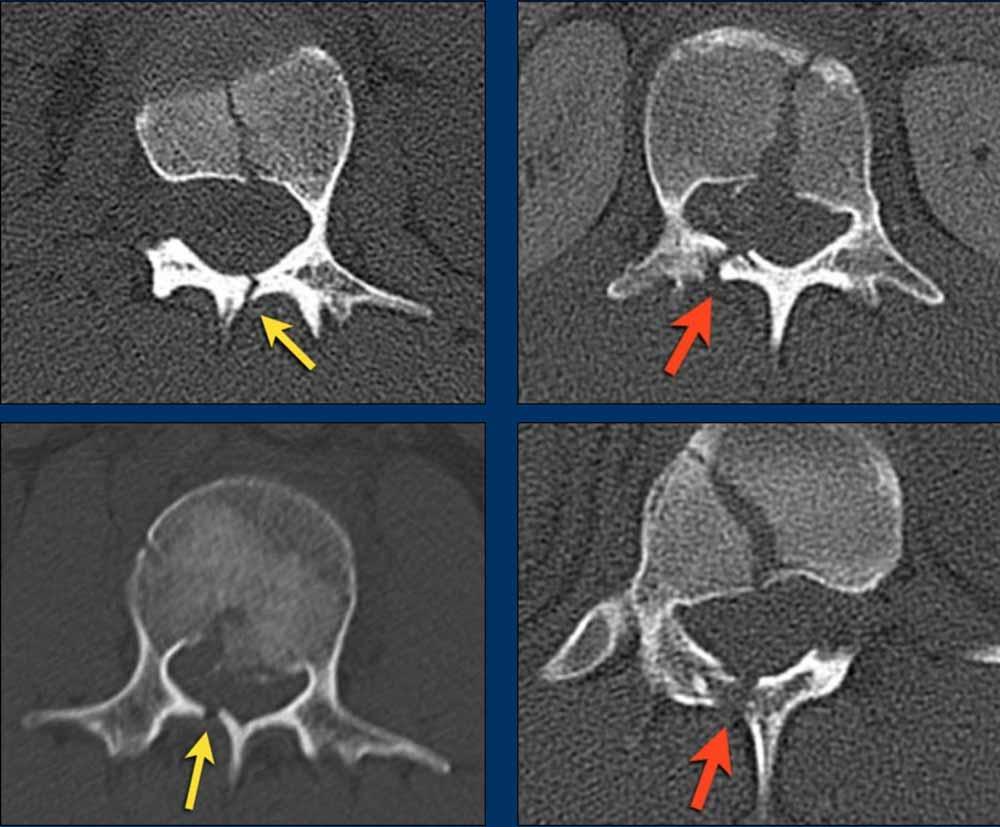 - Clear widening of the interspinous distance (yellow arrow)