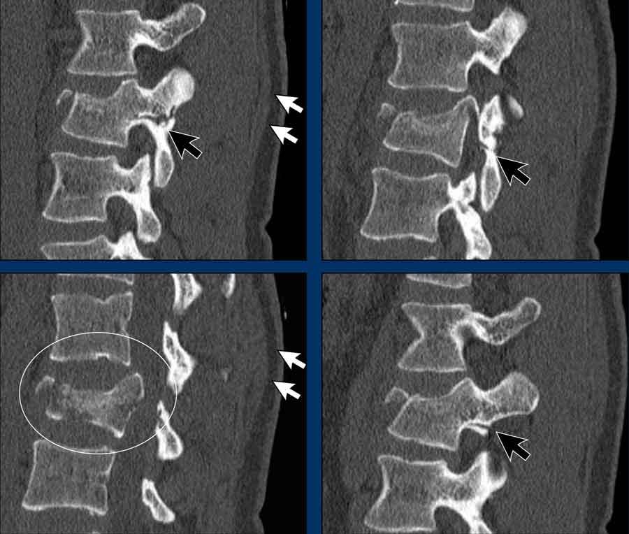 - Black arrows: horizontal fractures through the pedicles as a result of flexion distraction trauma.