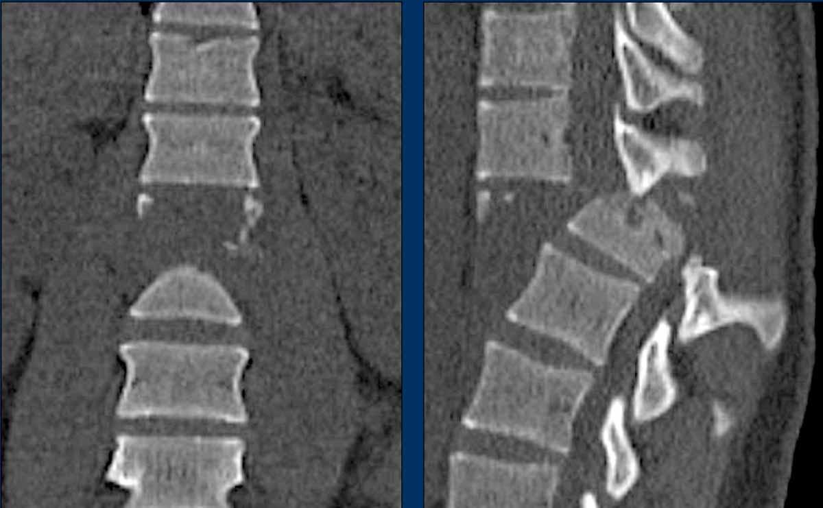 - In the coronal plane, a sagittal course of the fracture is seen, which is common in burst fractures.