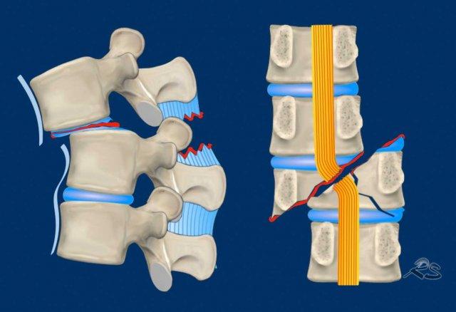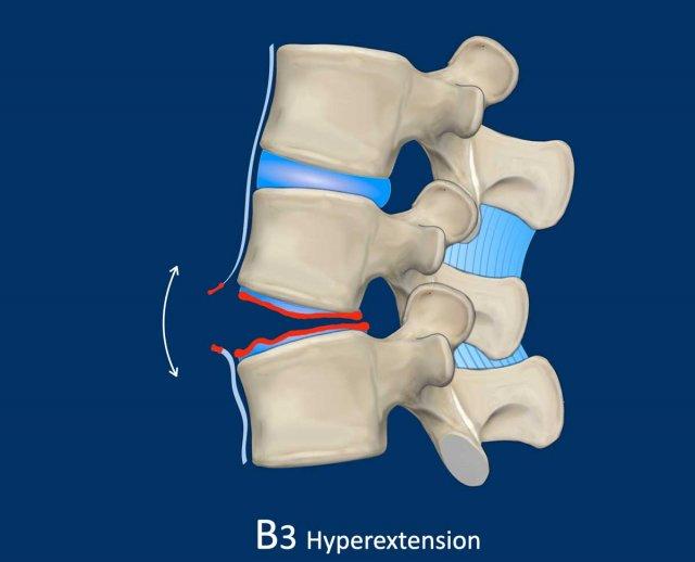 Usually a combination of osseous and non-osseous injury (B2), but ocassionally a purely osseous injury (B1). This is also known as Chance fracture. - Hyperextension with distraction of the tension band on the anterior side (B3). This is a common injury in patients with a stiff back.