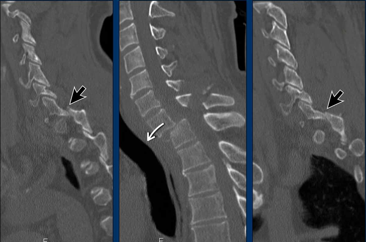 The displacement of the vertebrae (white arrow) is not as striking as in previous cases. - There are fractures of the spinous processes on multiple levels.