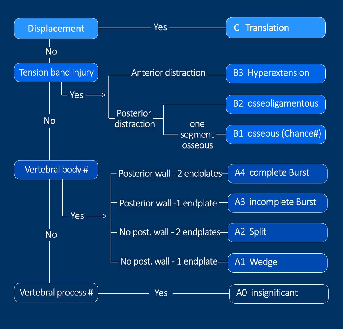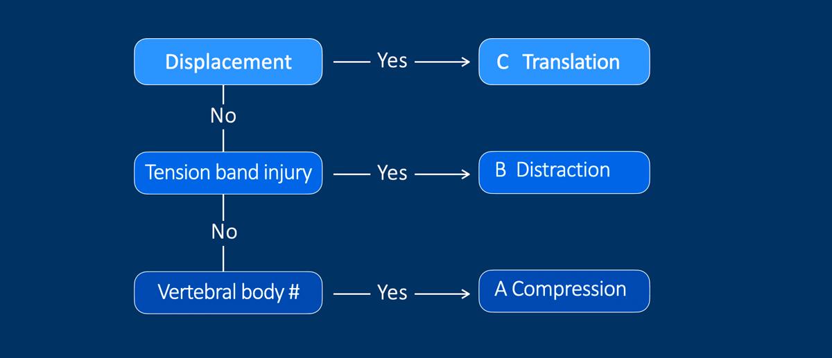 i.e. a translation injury (type C). - If it is not a C, then the next question is, whether there is an anterior or posterior tension band injury, i.e. a distraction injury (type B).