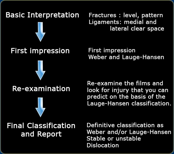 Ví dụ, nếu bạn thấy một gãy xương ở giai đoạn 2 trong hệ thống Lauge-Hansen, thì bạn biết rằng cũng có một tổn thương giai đoạn 1 và bạn sẽ nghiên cứu các phim X-quang với mức độ nghi ngờ cao về các dấu hiệu của giai đoạn 3 và 4.