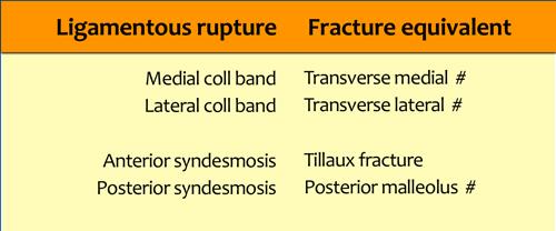 Thực tế đây là gãy xương cổ chân không vững, vì chắc chắn phải có kèm theo đứt dây chằng bên trong (giai đoạn 1), do đó vòng xương bị phá vỡ ở hai vị trí dẫn đến mất vững.