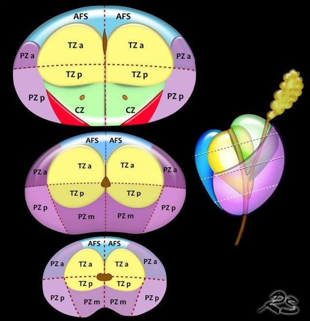 Cuộn qua các hình ảnh để xem các vùng mà tuyến tiền liệt được phân chia: