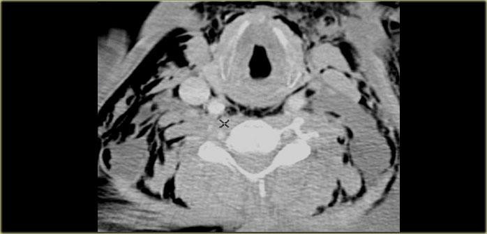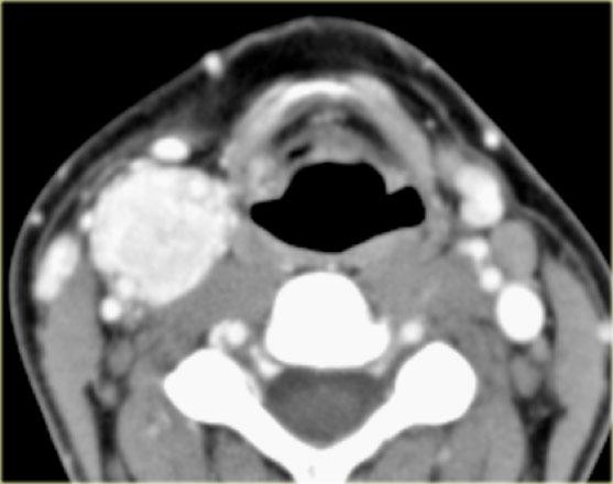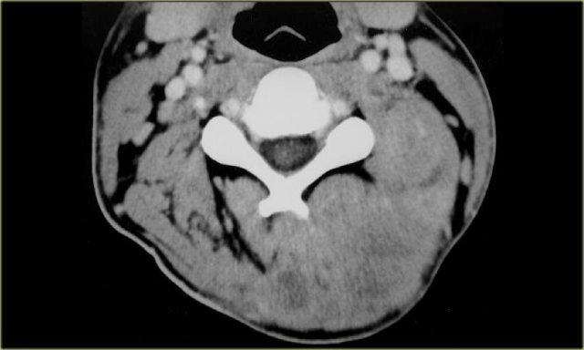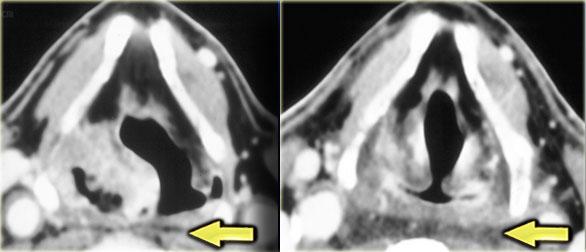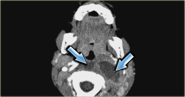 Bên trái là hình ảnh CT có tiêm thuốc cản quang qua vùng cổ trên của một bệnh nhân có triệu chứng sưng phồng chậm phát triển ở phía sau bên trái cổ.