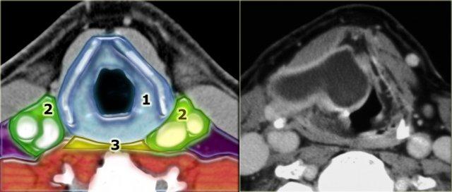 Bên trái là hình CT ở mức sụn giáp.