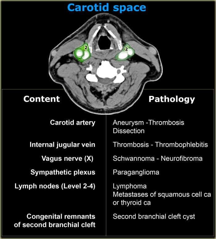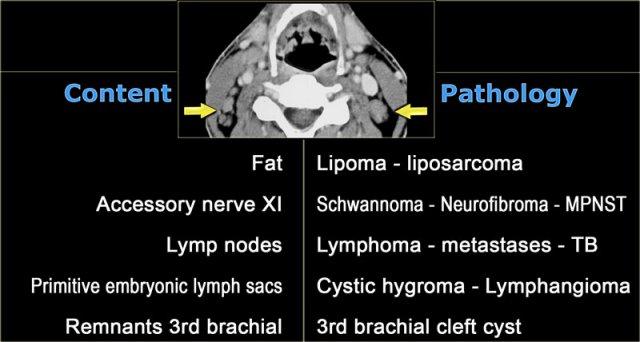 Bên trái là bảng tóm tắt các thành phần bình thường của khoang cổ sau và các bệnh lý tương ứng.