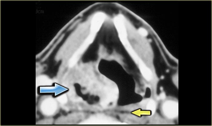 Phía dưới túi thoát vị thanh quản này là một khối u nhỏ ngấm thuốc ở buồng thanh quản (mũi tên đỏ).