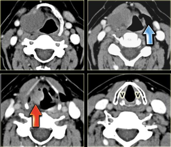 TRÁI: Hình CT mặt phẳng vành qua thanh quản với giải phẫu bình thường: dây thanh giả (F), dây thanh thật (T) và buồng thanh quản ở giữa (V). PHẢI: Túi thoát vị thanh quản thứ phát trong và ngoài chứa dịch do khối u nhỏ ngấm thuốc ở buồng thanh quản (T) gây tắc nghẽn buồng thanh quản. Bên trái là túi thoát vị thanh quản nguyên phát trong và ngoài chứa khí.