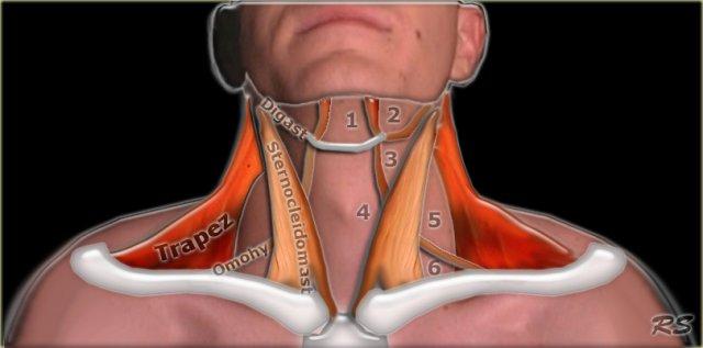 Lưu ý cơ vai móng (musculus omohyoideus) trong hình minh họa.