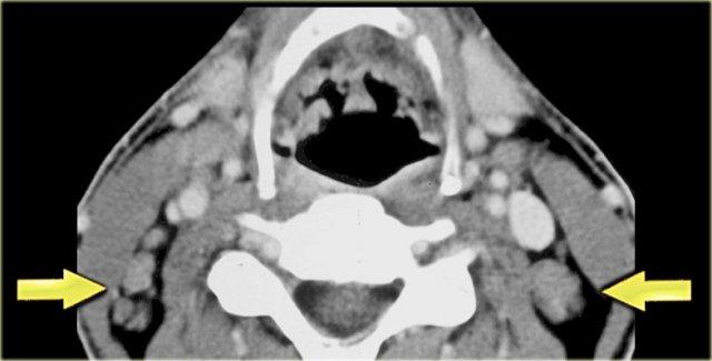 Hình ảnh CT tại mức xương móng cho thấy nhiều tổn thương dạng tròn nằm ở phía trong cơ ức đòn chũm và phía sau tĩnh mạch cảnh trong.