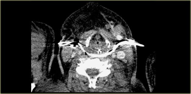 Lát cắt CT cho thấy tổn thương ở mức thanh quản trên thanh môn và sụn giáp.