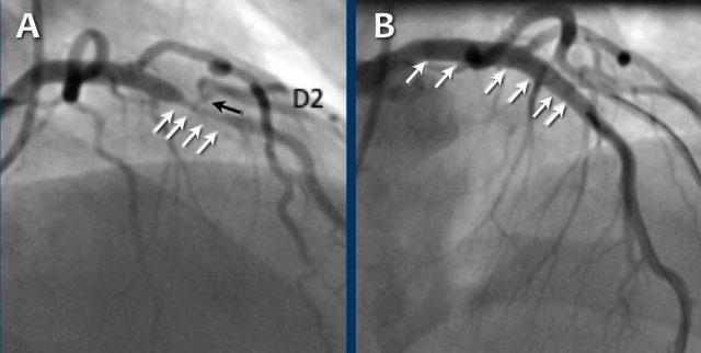 (white arrows) and a 60% stenosis in the D2 branch (black arrows). The D2