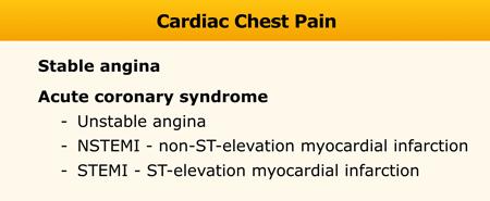Cardiac chest pain can be categorized into stable angina, unstable angina, non-ST-elevation myocardial infarction (NSTEMI) and ST-elevation myocardial infarction (STEMI) (2,3).