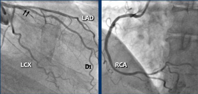 The D1 shows 50% stenosis at the origin (black arrows). The LCX shows some wall