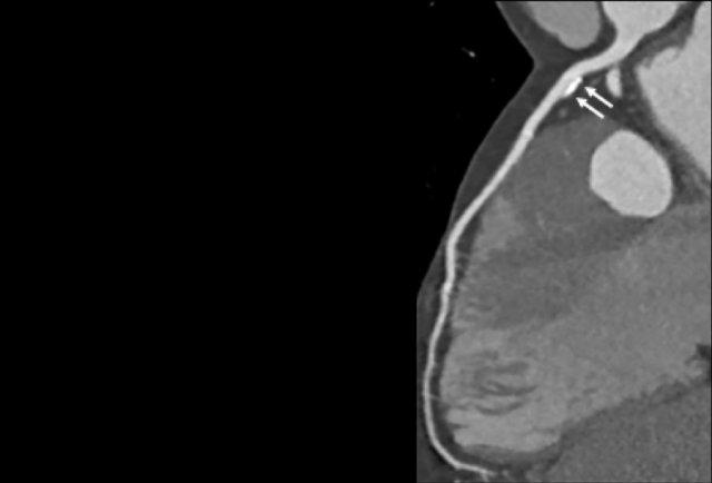 in the proximal RCA with minimal stenosis (<25%) (white arrows).