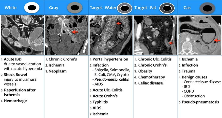 Hình ảnh cung cấp tổng quan về các kiểu ngấm thuốc thành ruột trên CT ở bệnh nhân có dày thành ruột.